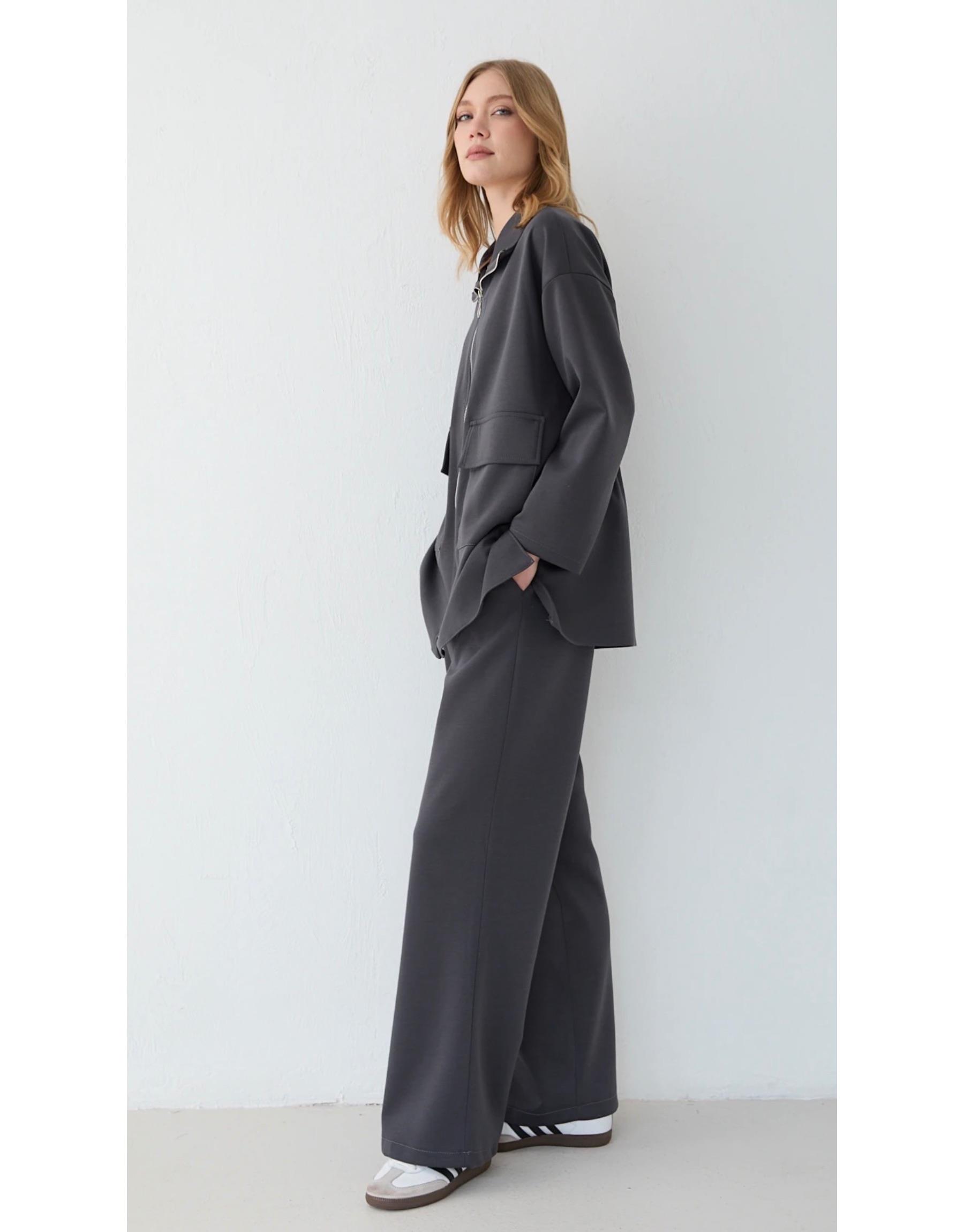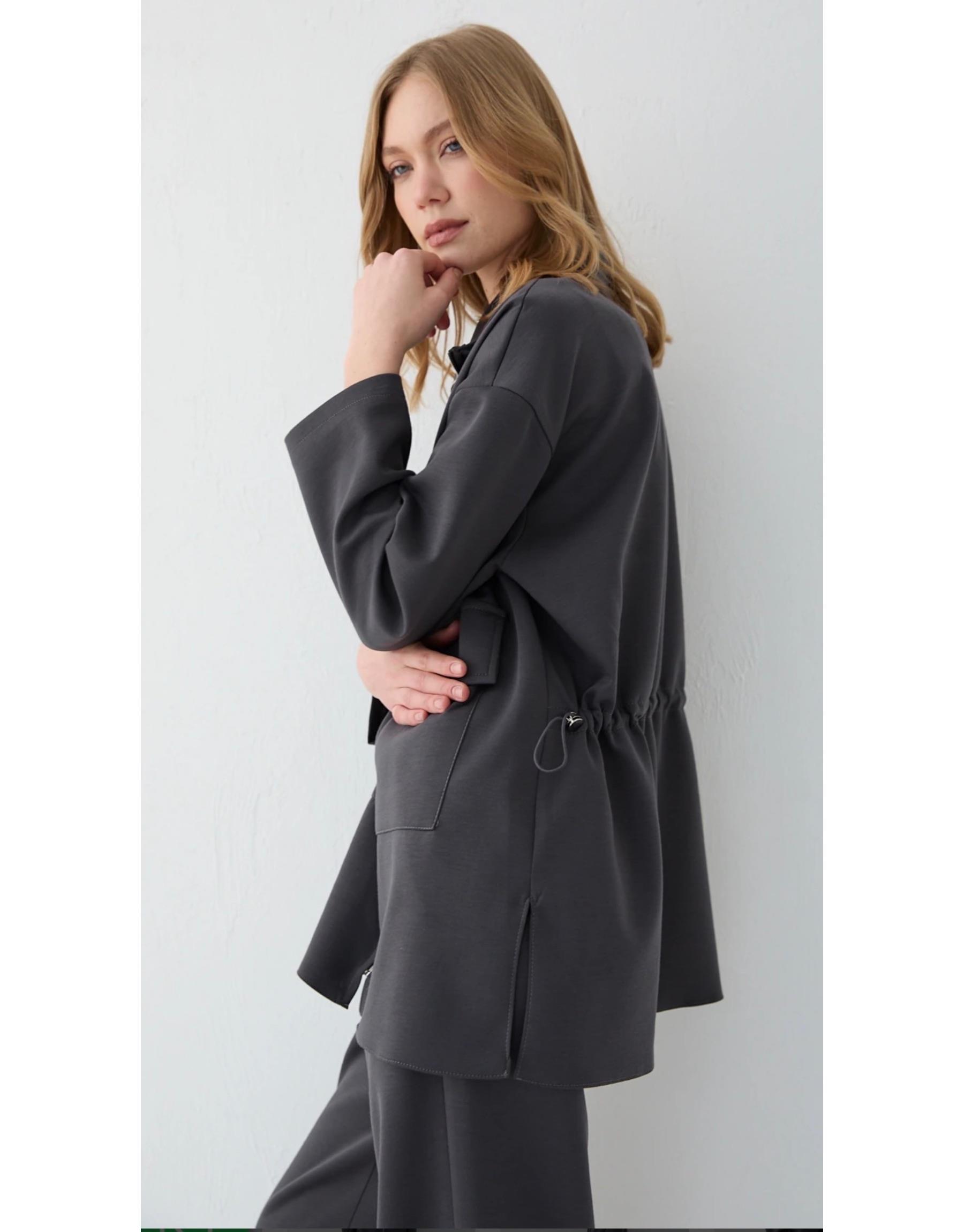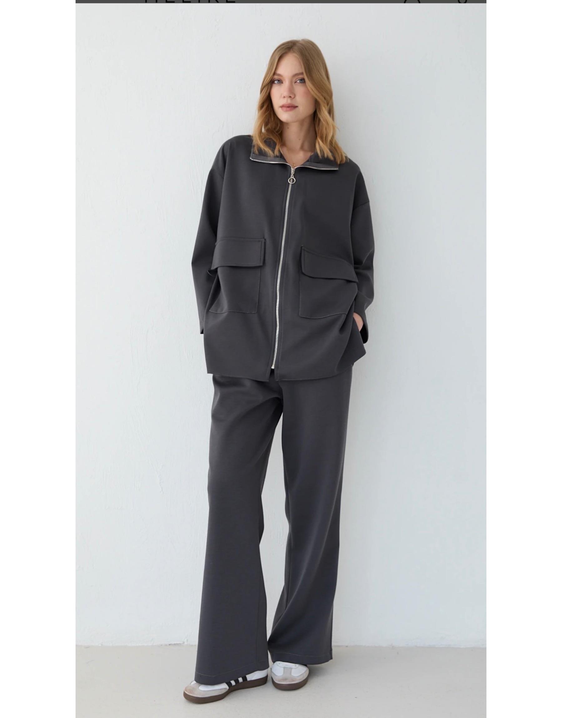 Önden fermuarlı tasarımı, düşük omuz kesimi ve ön cep detayıyla modern ve rahat bir görünüm sunan takım; arka beldeki ayarlanabilir lastik detayıyla vücuda uyum sağlar. Yanlardan 13 cm yırtmaçlı etek ucu hareket özgürlüğü sağlarken pantolonun lastikli beli ve yan cepleri günlük kullanımda konfor sunar. Modal kumaşın yumuşak ve akıcı yapısı sayesinde gün boyu rahat bir kullanım sağlar.