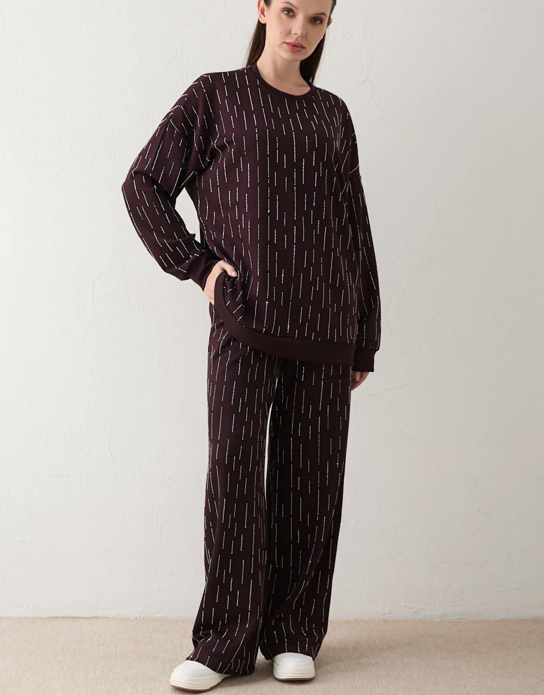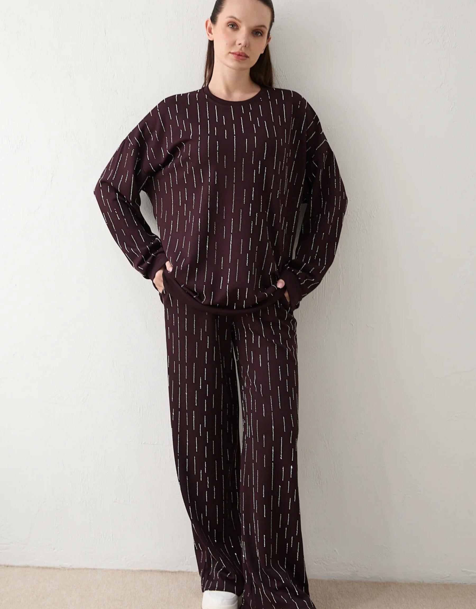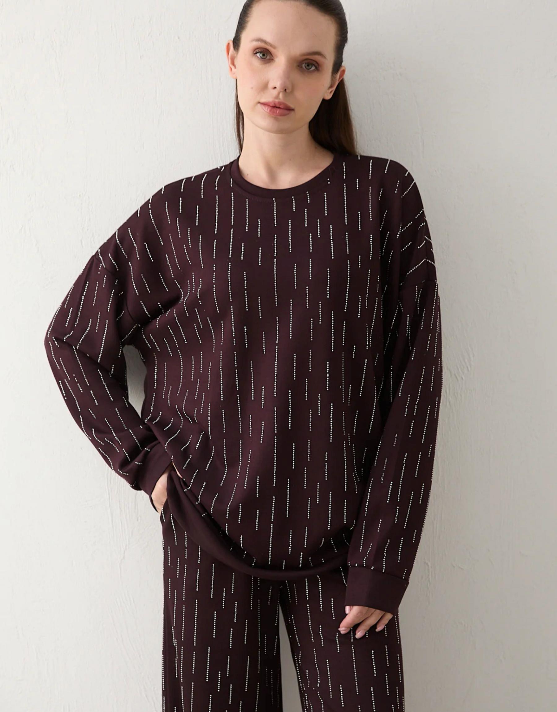 Şık ve iddialı tasarımıyla öne çıkan bu takım, full taş detayları ile göz alıcı bir görünüm sunar. Düşük omuz kesimi modern bir duruş kazandırırken, modal kumaş yapısı sayesinde konforlu ve akıcı bir kullanım sağlar. Pantolonun lastikli ve ayarlanabilir ipli bel yapısı gün boyu rahatlık sunar.