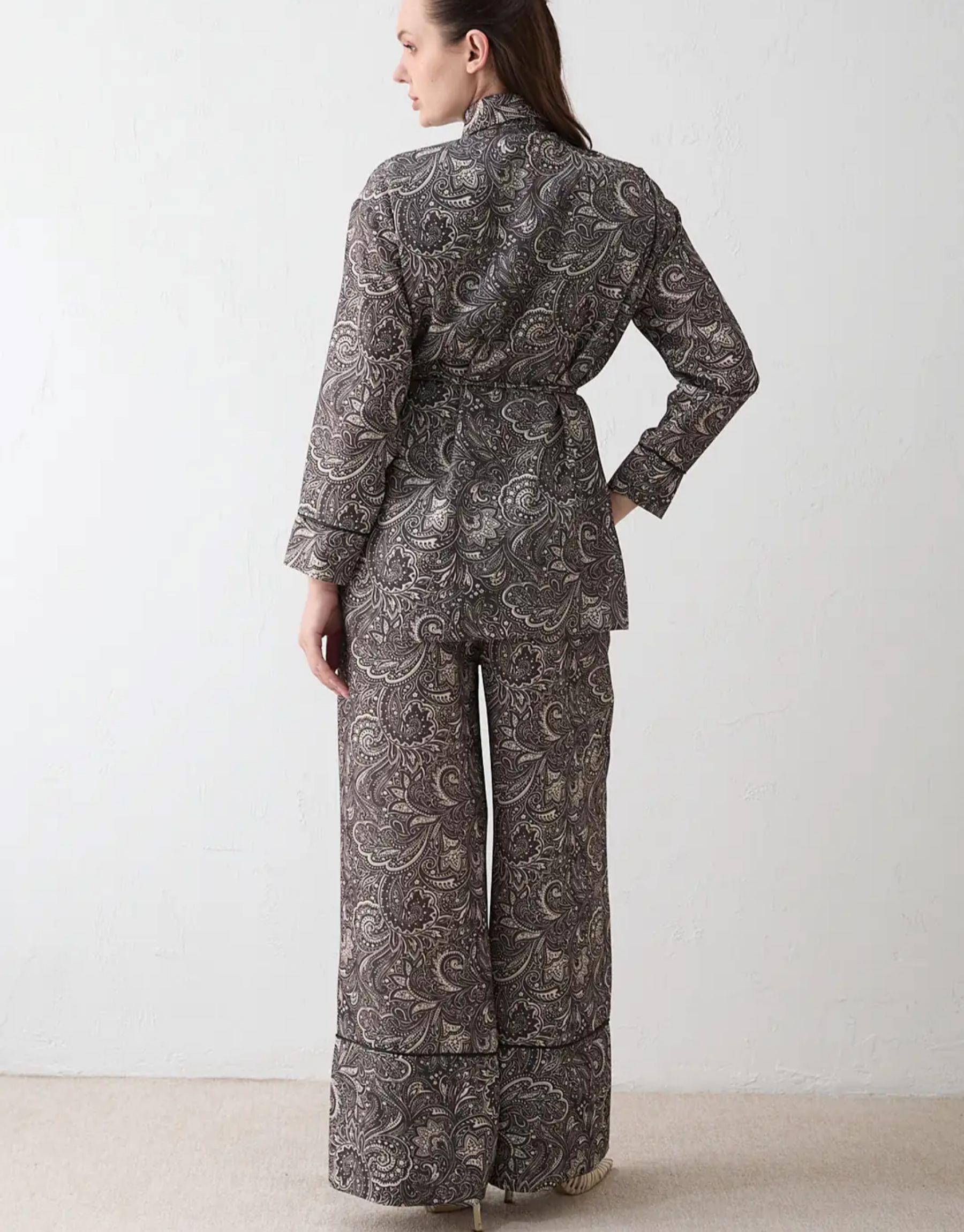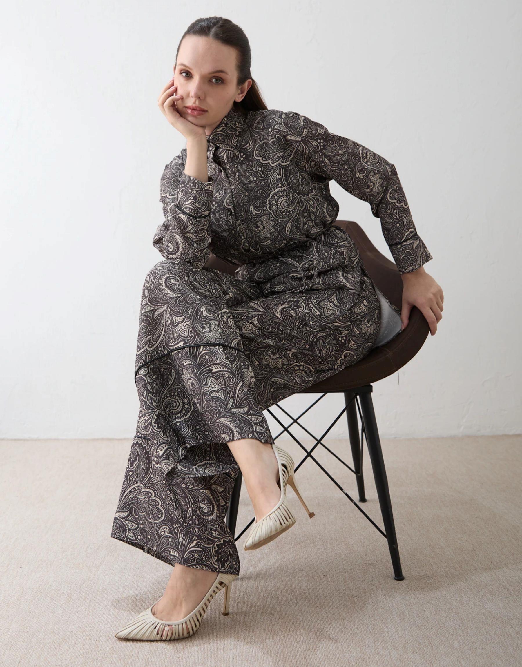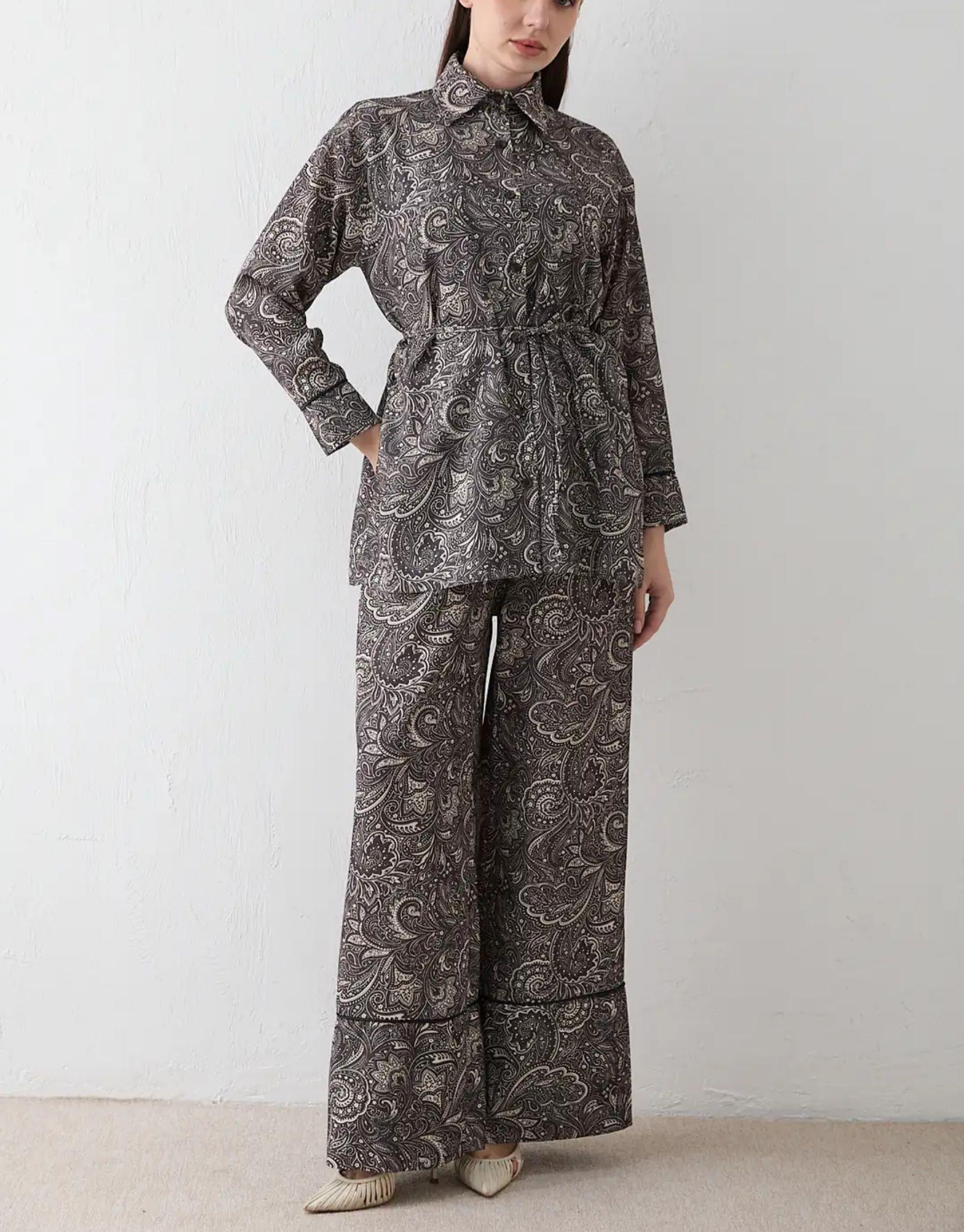 Modern çizgileri ve rahat kalıbıyla öne çıkan bu takım, baskılı krep kumaşı sayesinde şık ve dinamik bir görünüm sunar. Önden düğmeli üst formu ve yan yırtmaç detayı hareket özgürlüğü sağlarken, lastikli bel yapısına sahip pantolonu gün boyu konforlu bir kullanım sunar. Günlük şıklık için ideal bir tercihtir.