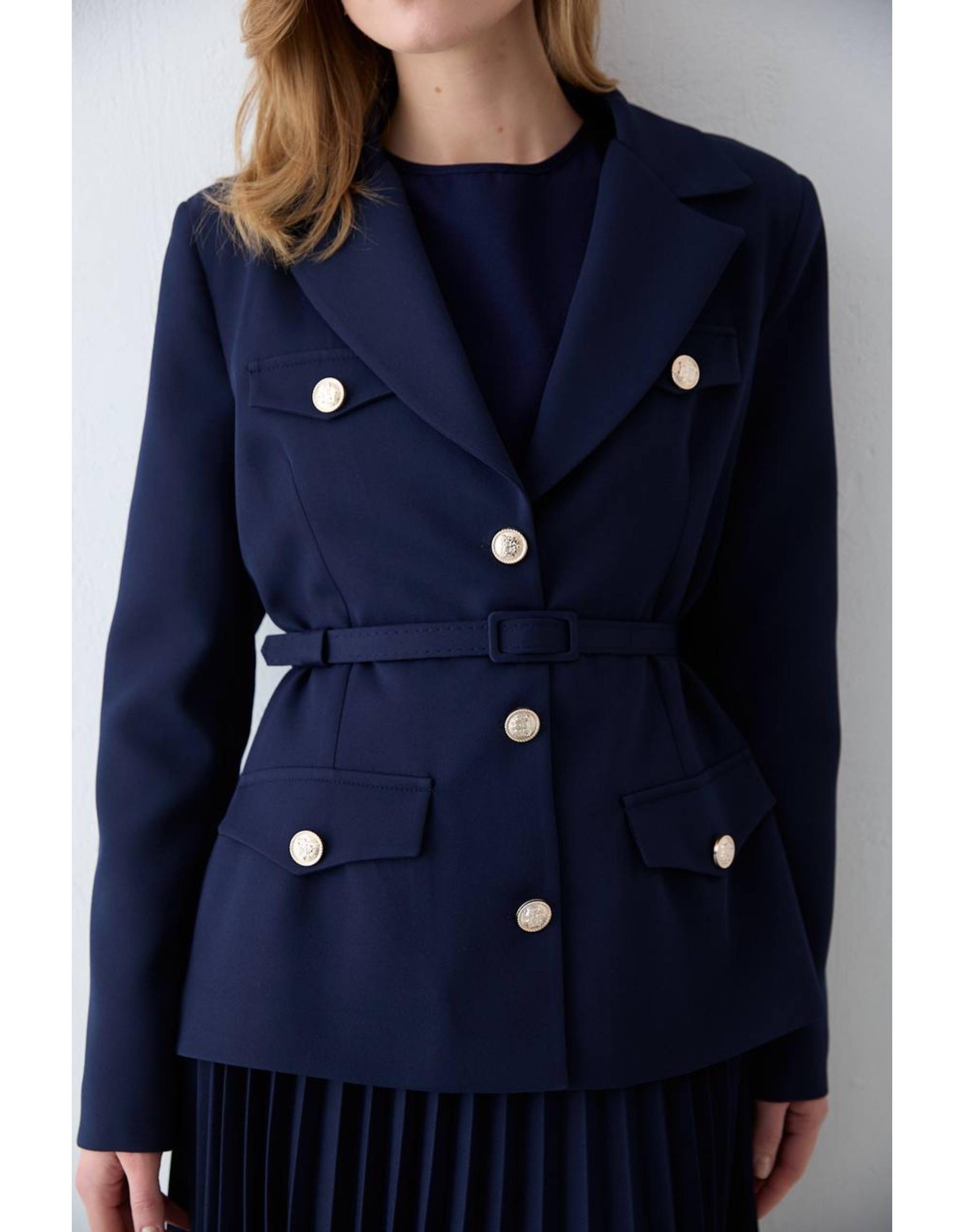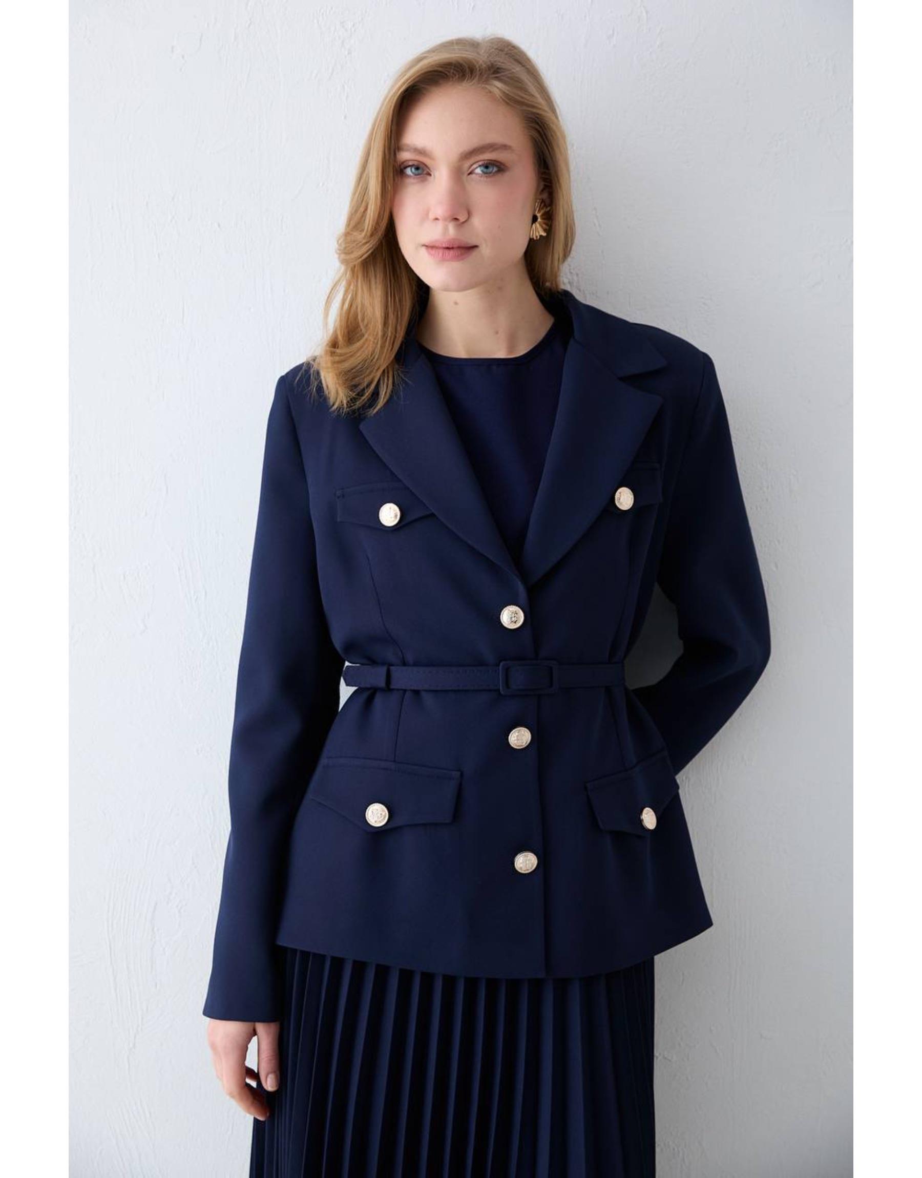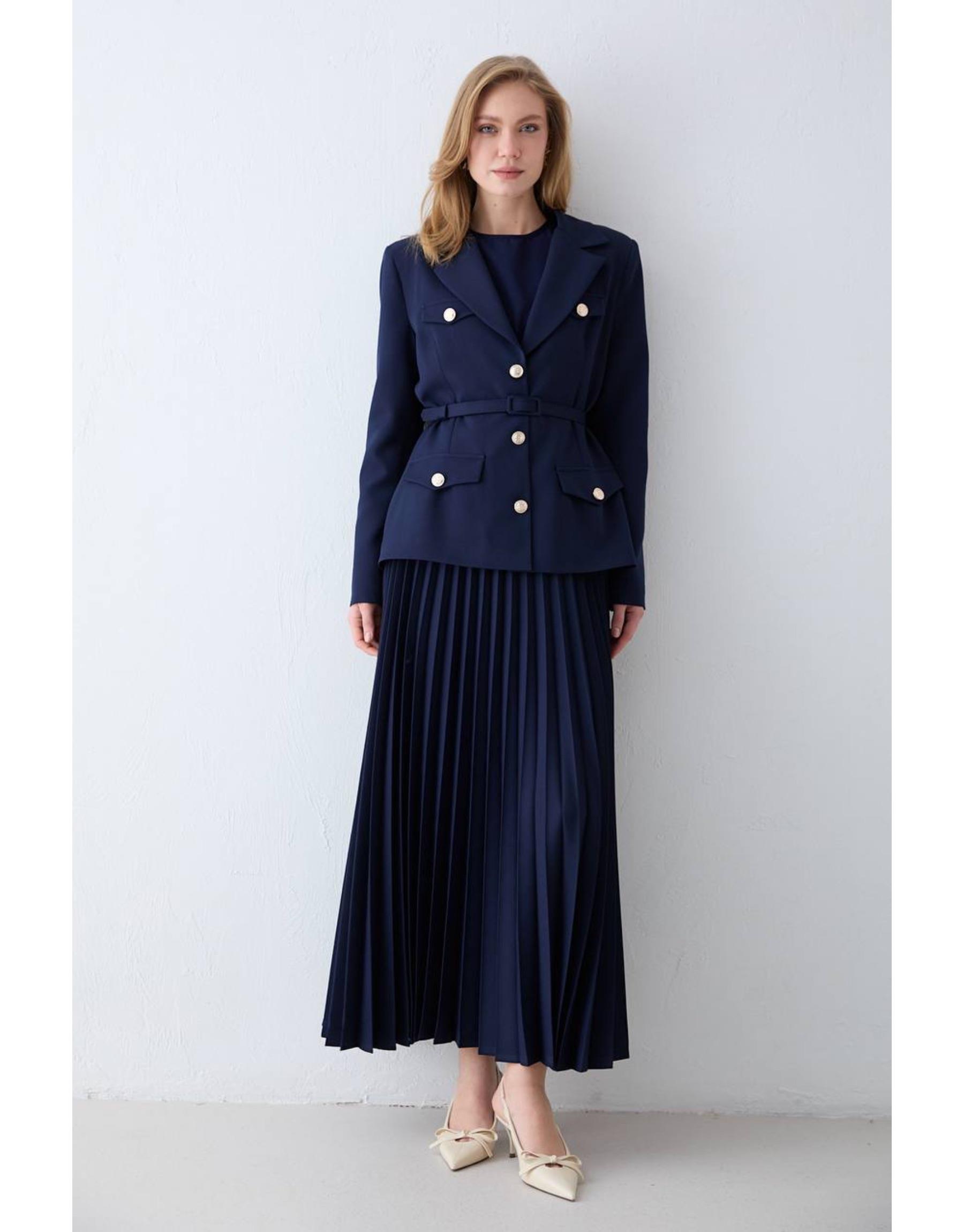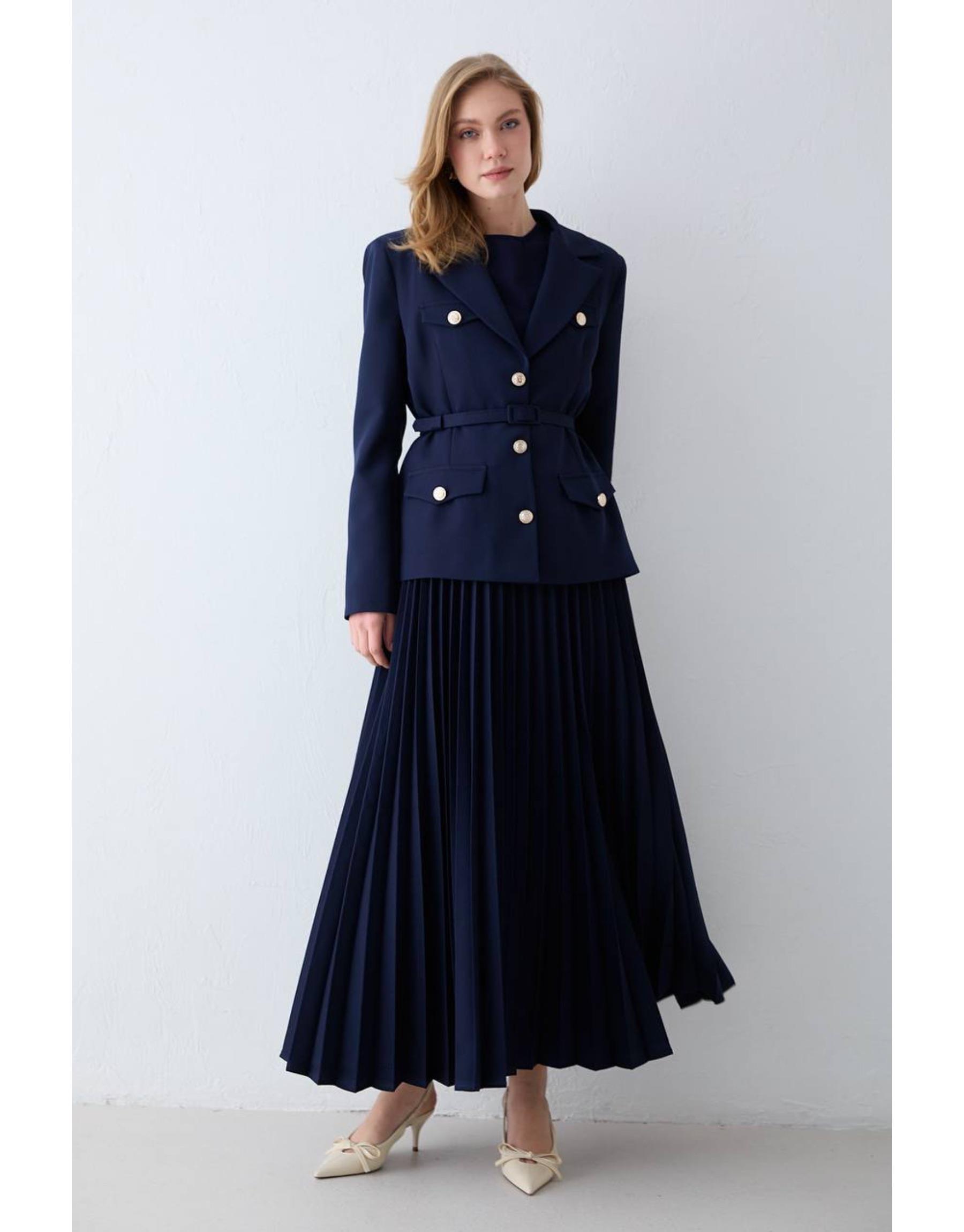 Zarif ve güçlü duruşu bir araya getiren bu takım, modern kesimi ve şık detaylarıyla öne çıkar. Vatkalı omuz yapısı net bir siluet oluştururken, pileli eteği hareketli ve feminen bir görünüm sunar. Double krep kumaşı sayesinde hem konforlu hem de tok bir duruş sağlar.