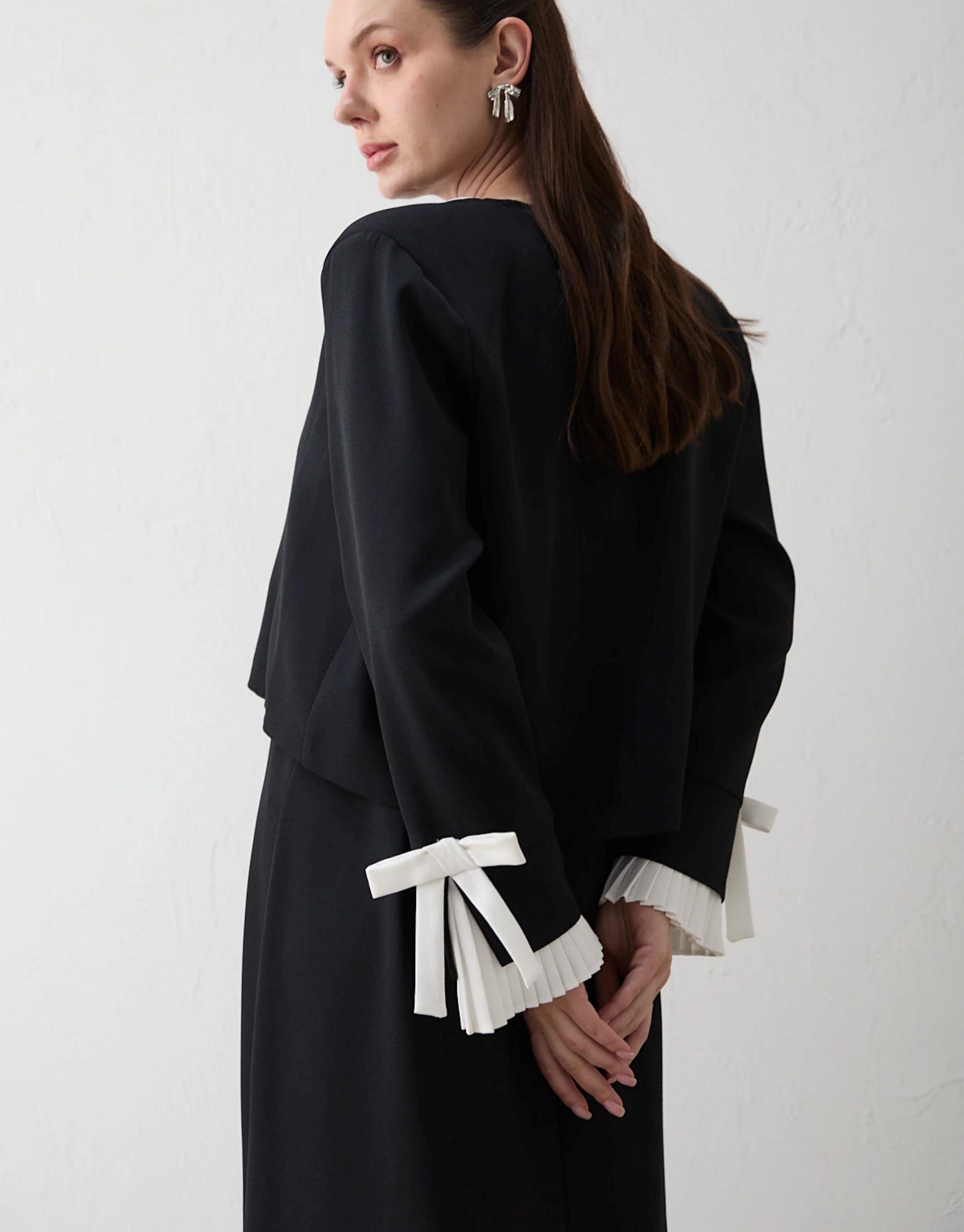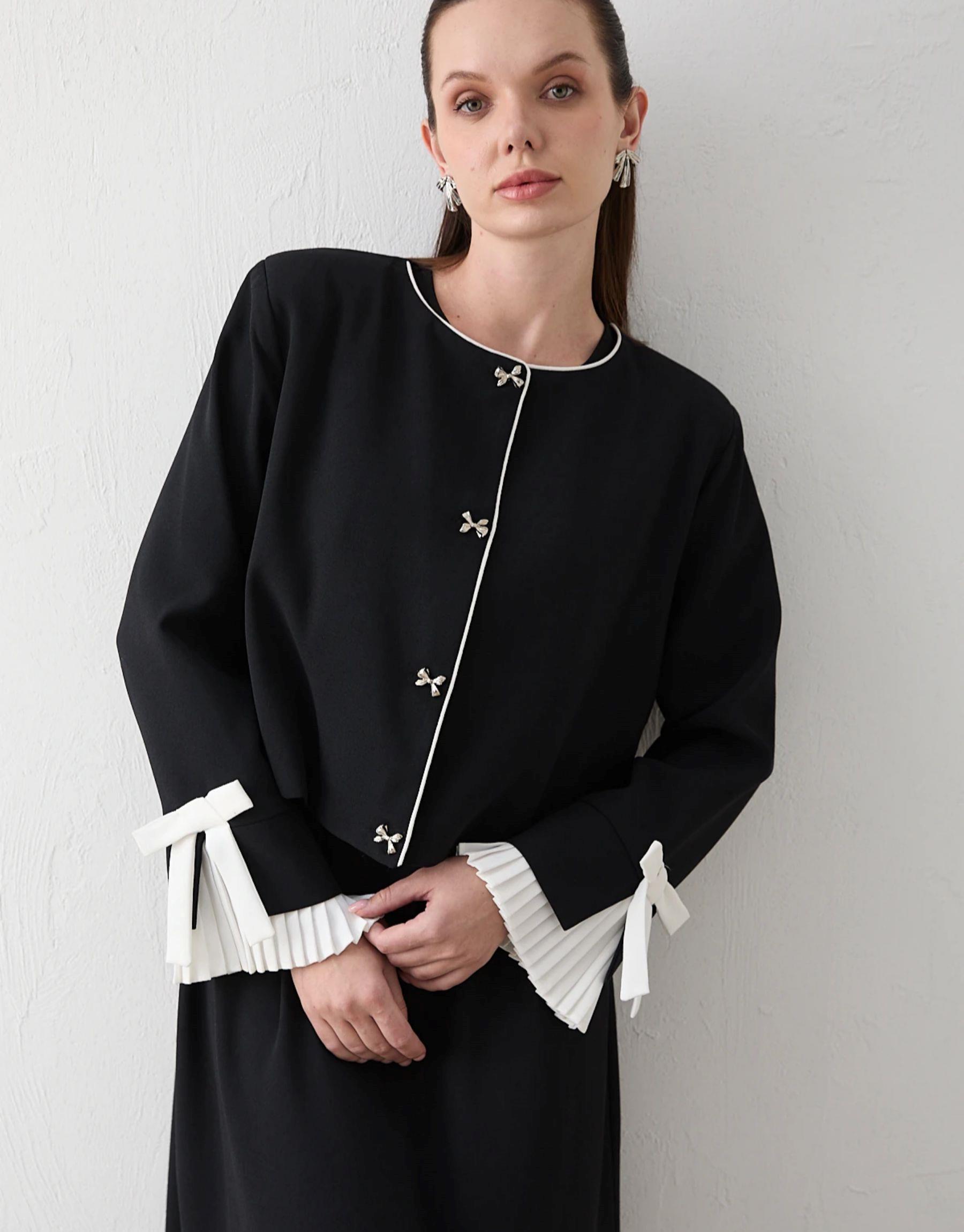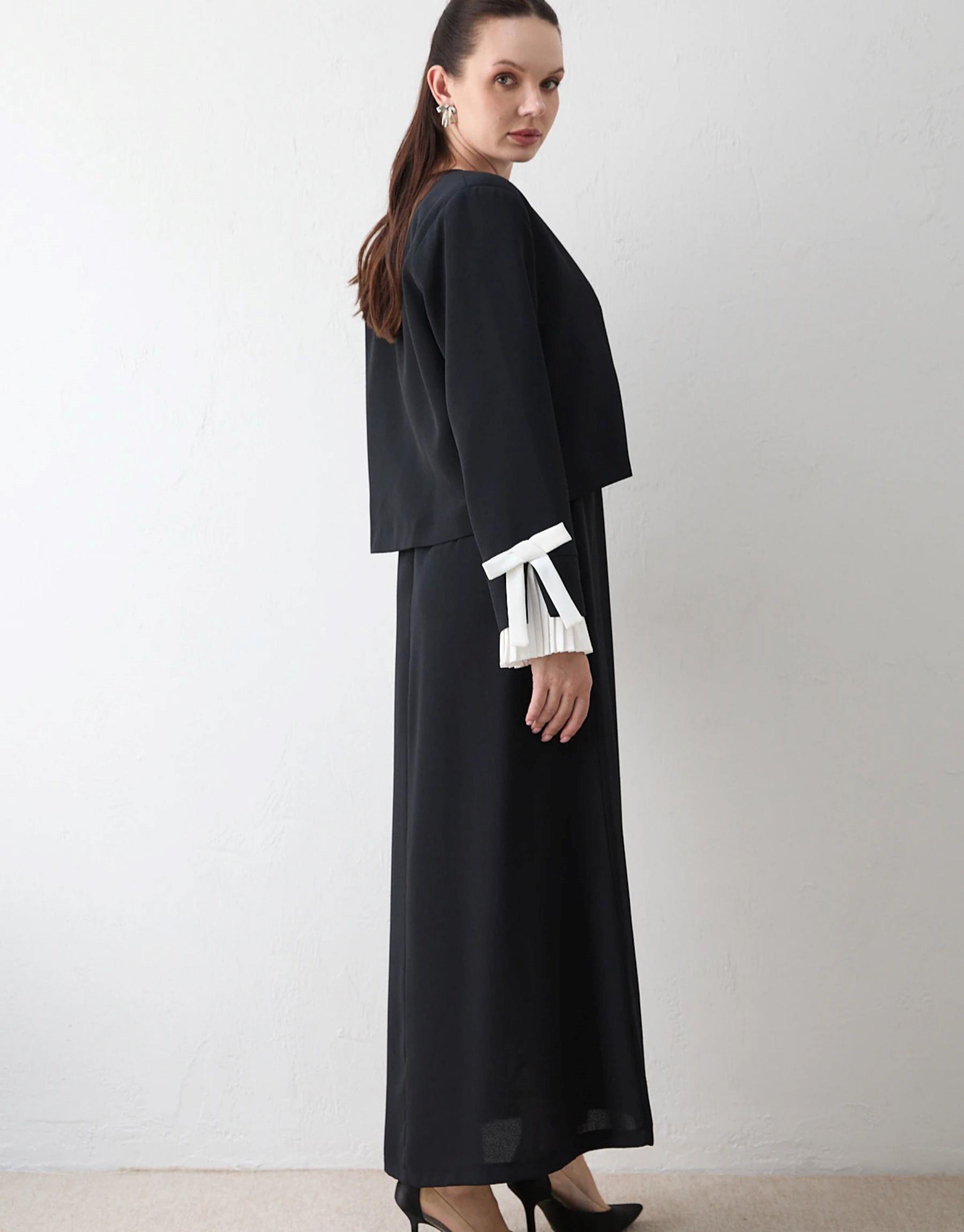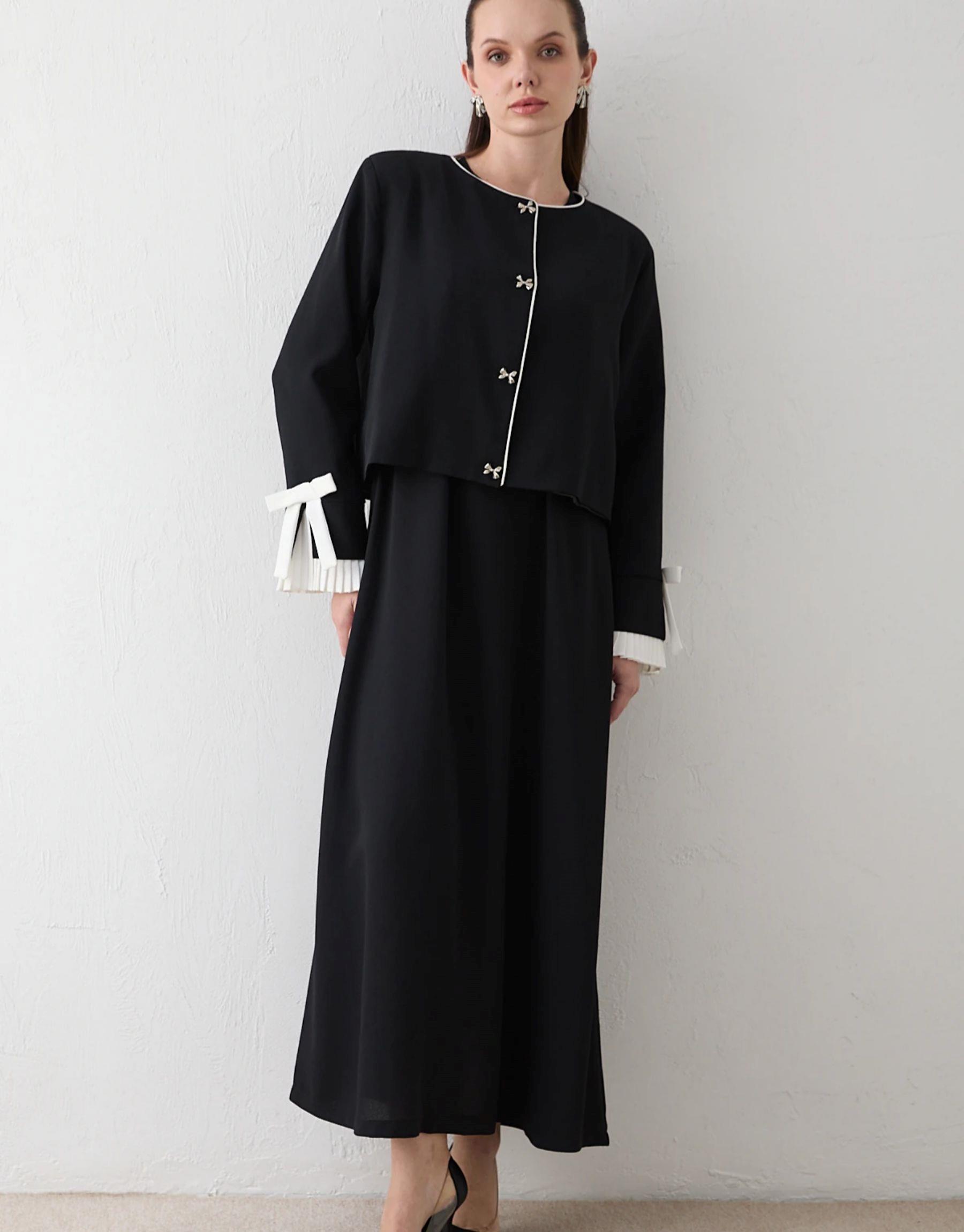Zarif detayları ve feminen dokunuşlarıyla öne çıkan bu iki parçalı elbise takımı, özel günlerden şık davetlere kadar stilinizi tamamlar. Vatkalı omuz yapısı ve kurdele–pilise detaylı kollar üst parçaya sofistike bir hava katarken, iç elbisenin pencere detayı modern bir görünüm sunar. Astarlı yapısı ve krep kumaşı sayesinde dökümlü, şık ve konforlu bir kullanım sağlar.