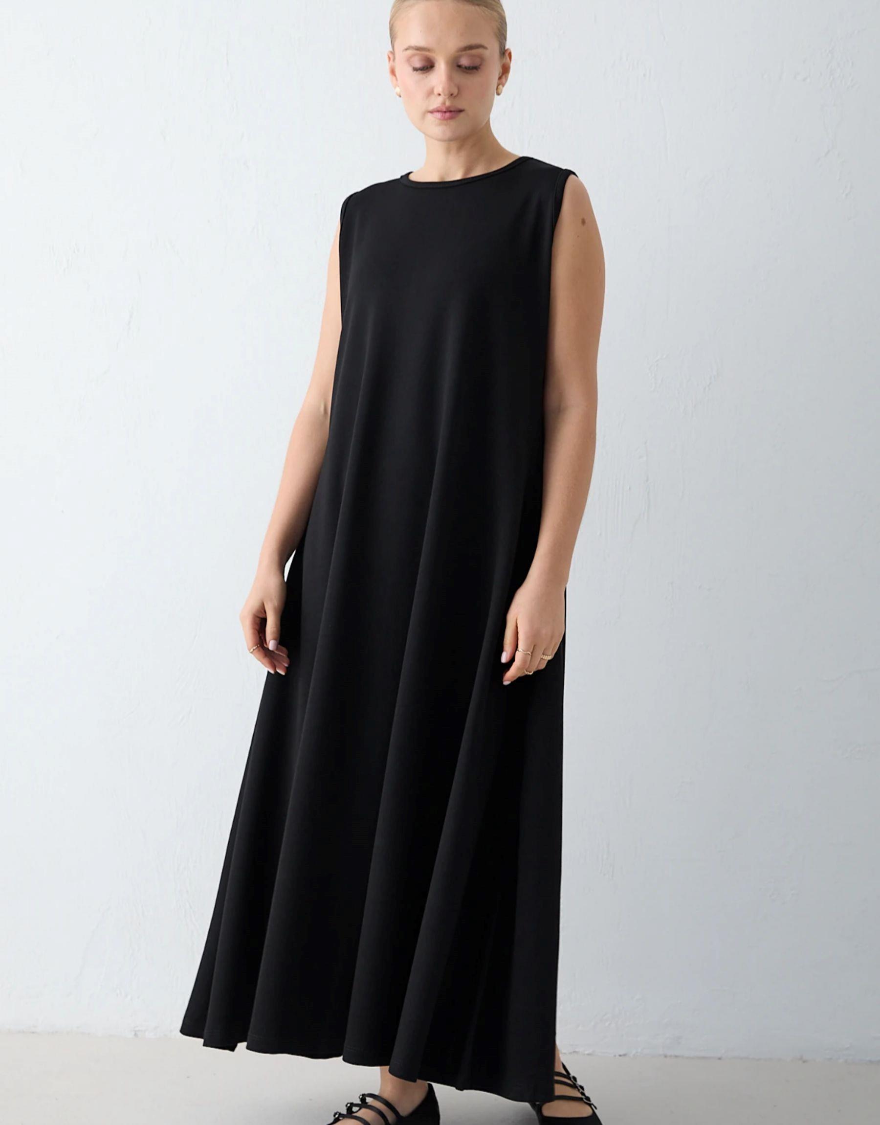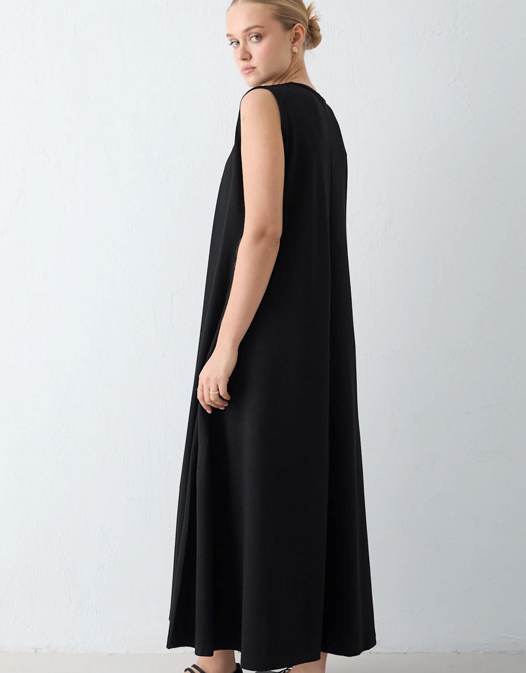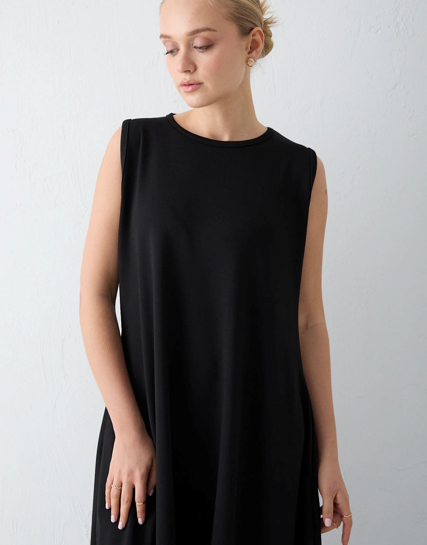 Bisiklet yaka formu ve sıfır kol kesimiyle sade ve modern bir duruş sunan bu elbise, modal kumaş yapısı sayesinde dökümlü ve konforlu bir kullanım sağlar. Yan cepleri günlük kullanımda pratiklik sunarken, rahat kalıbıyla gün boyu konfor sağlar.