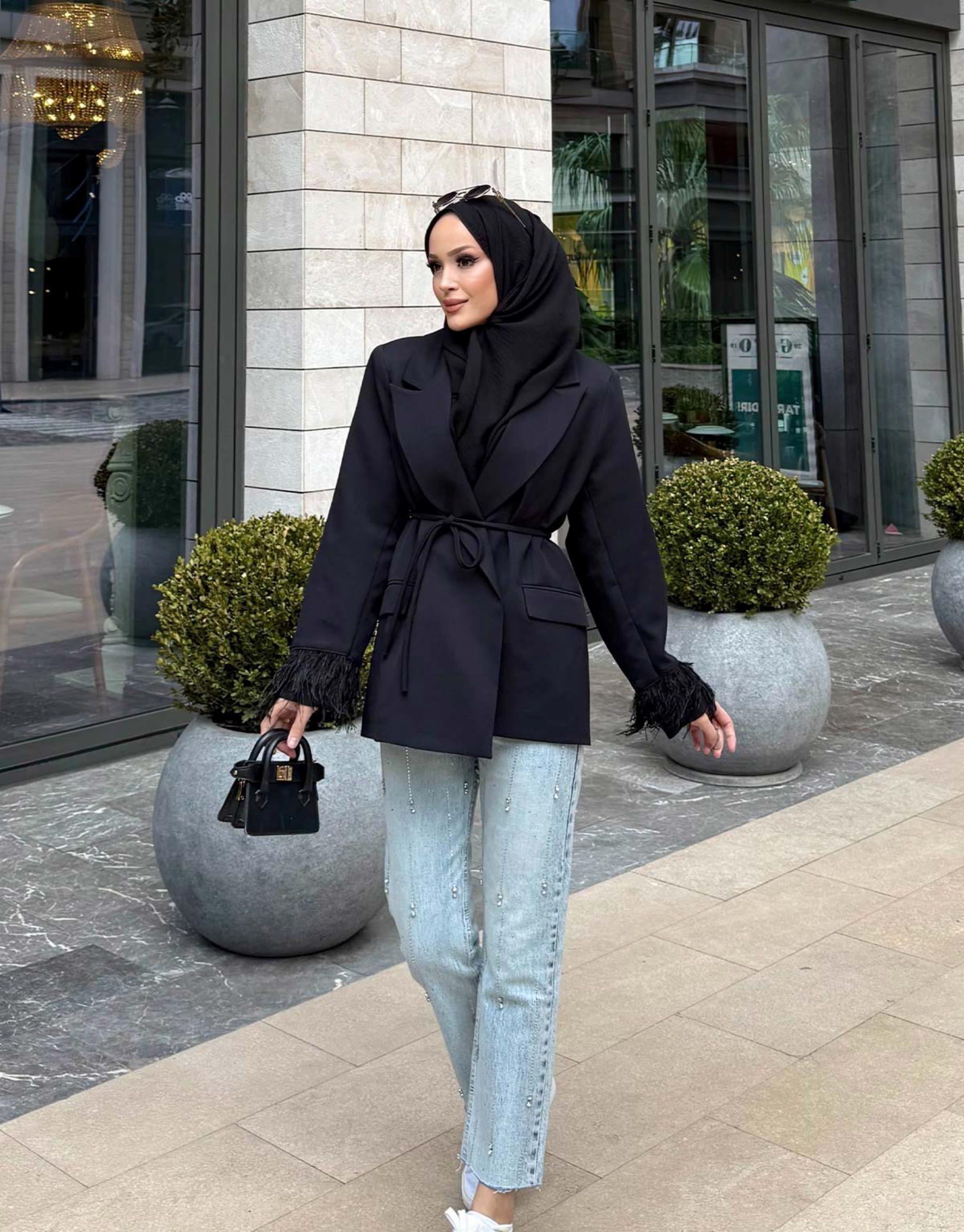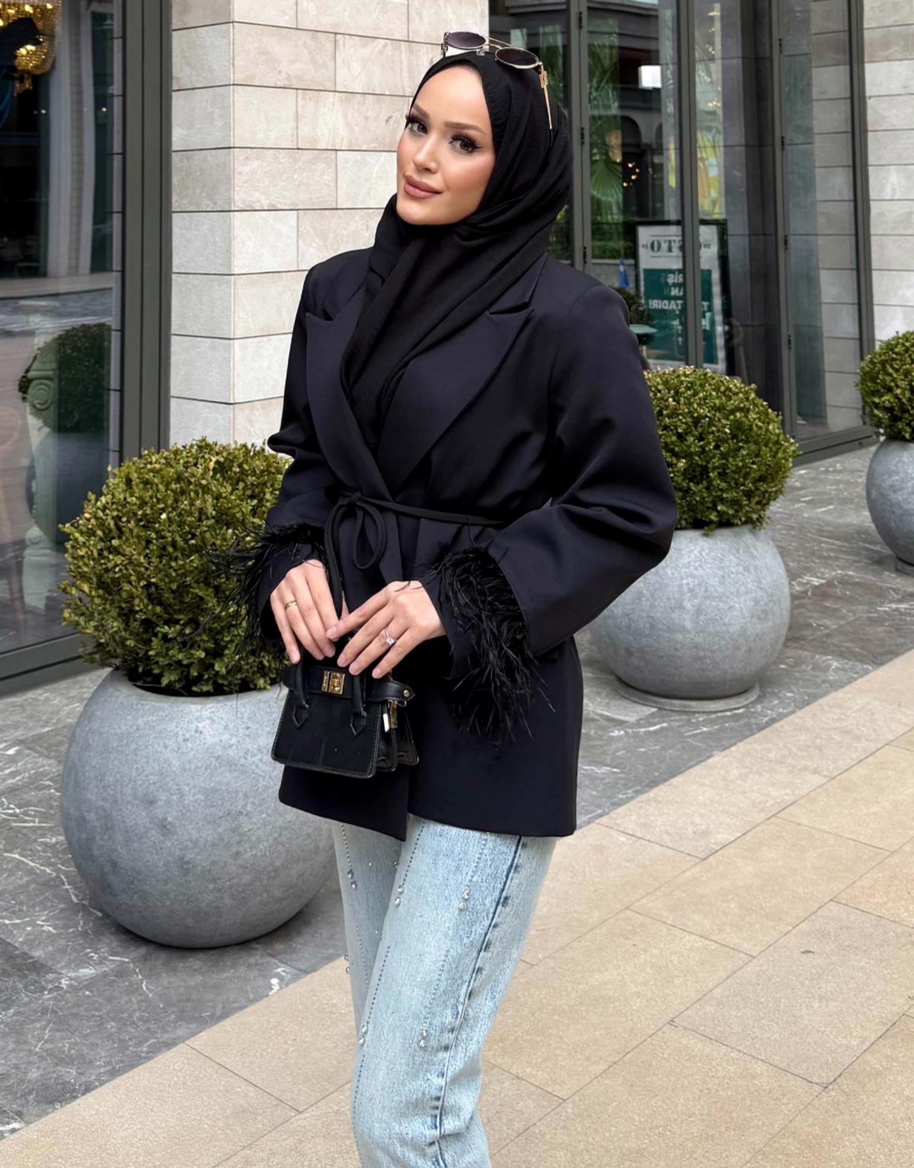 Modern ve zarif tasarımıyla öne çıkan bu ceket, vatkalı omuz detayıyla güçlü bir silüet sunar. İnce seyyar ip ve cep detayları şıklığı tamamlarken, kol uçlarındaki tüy detayları tasarıma sofistike bir hava katar. Astarlı yapısıyla konfor sağlayan bu parça, şık kombinleriniz için ideal bir seçenektir.