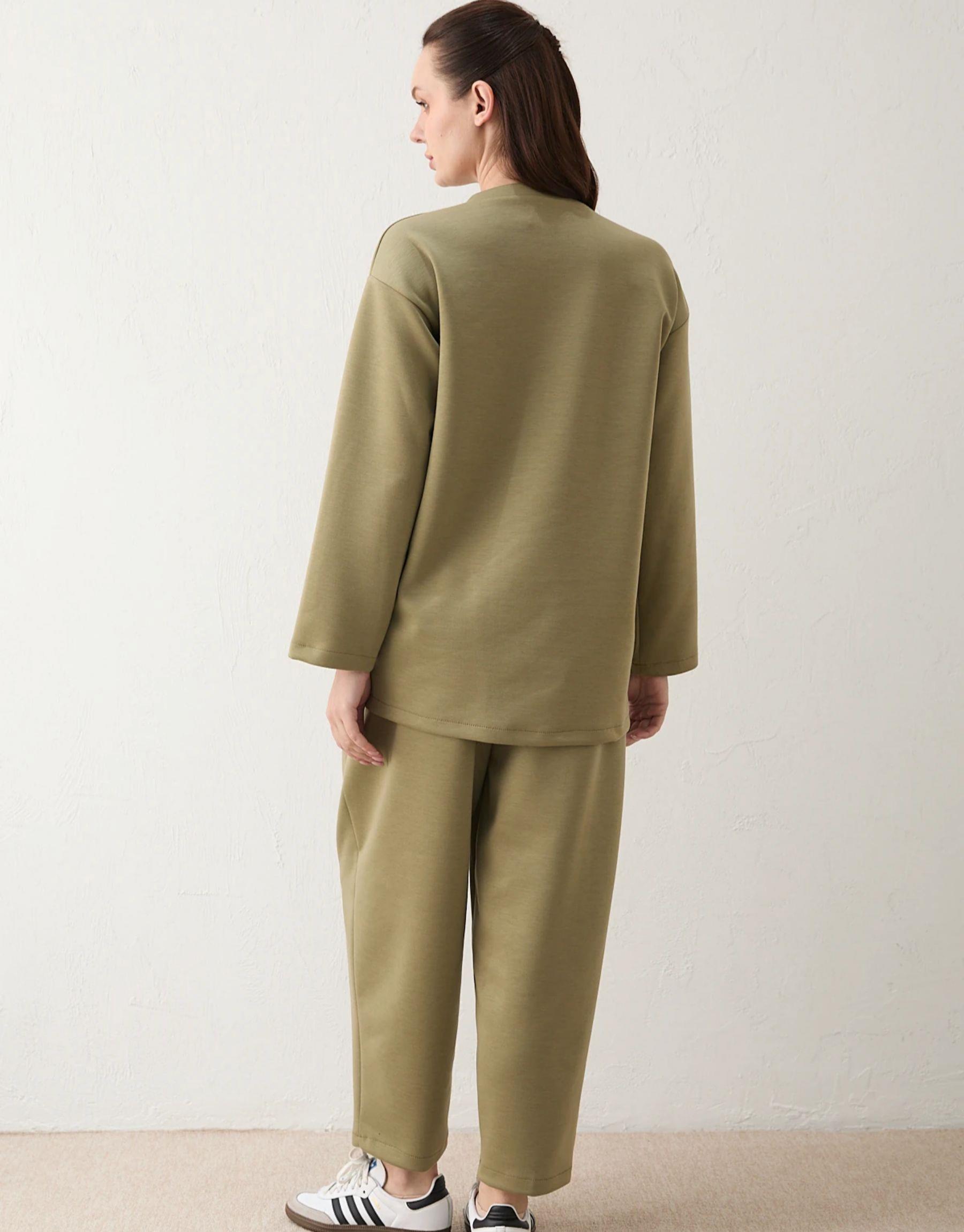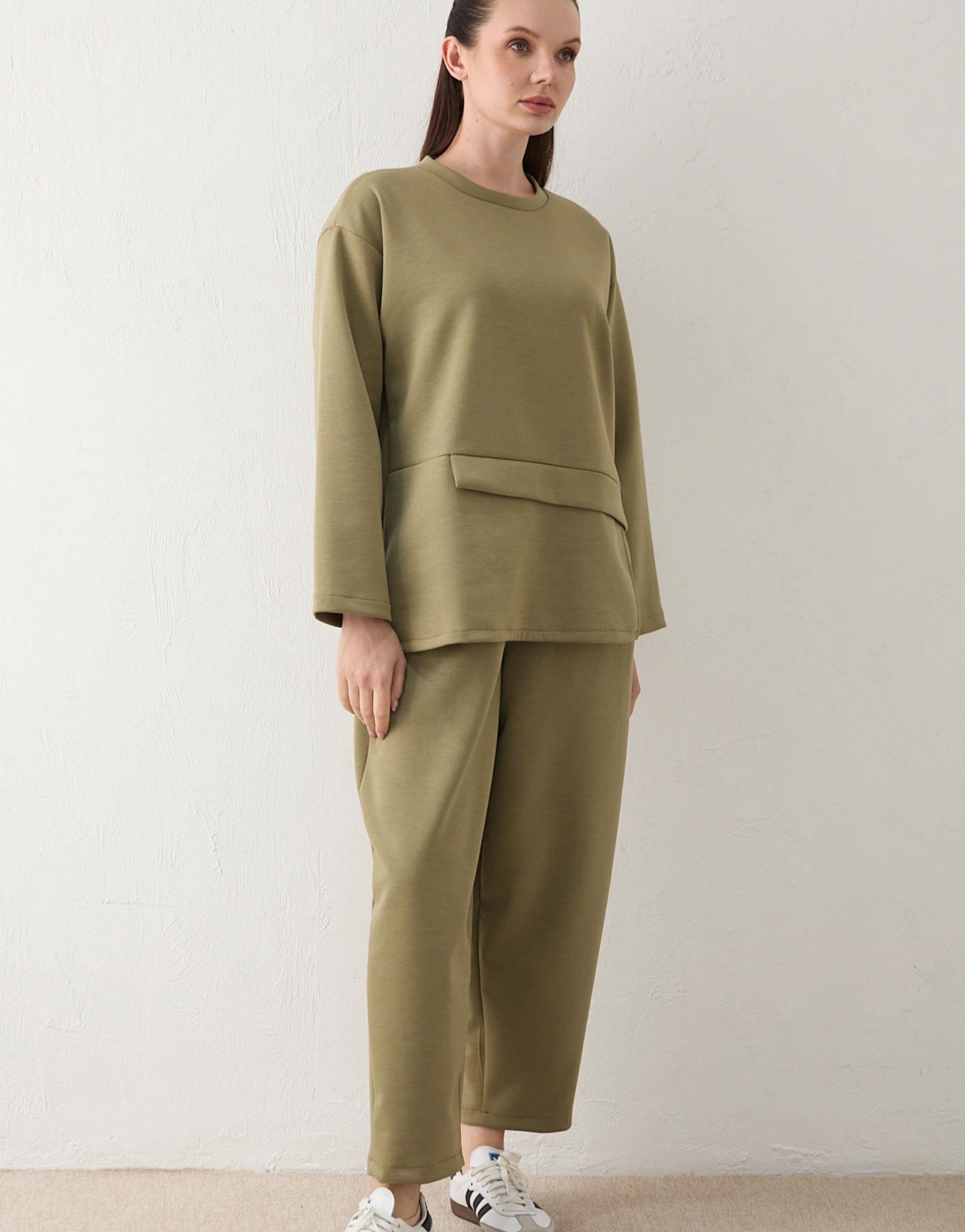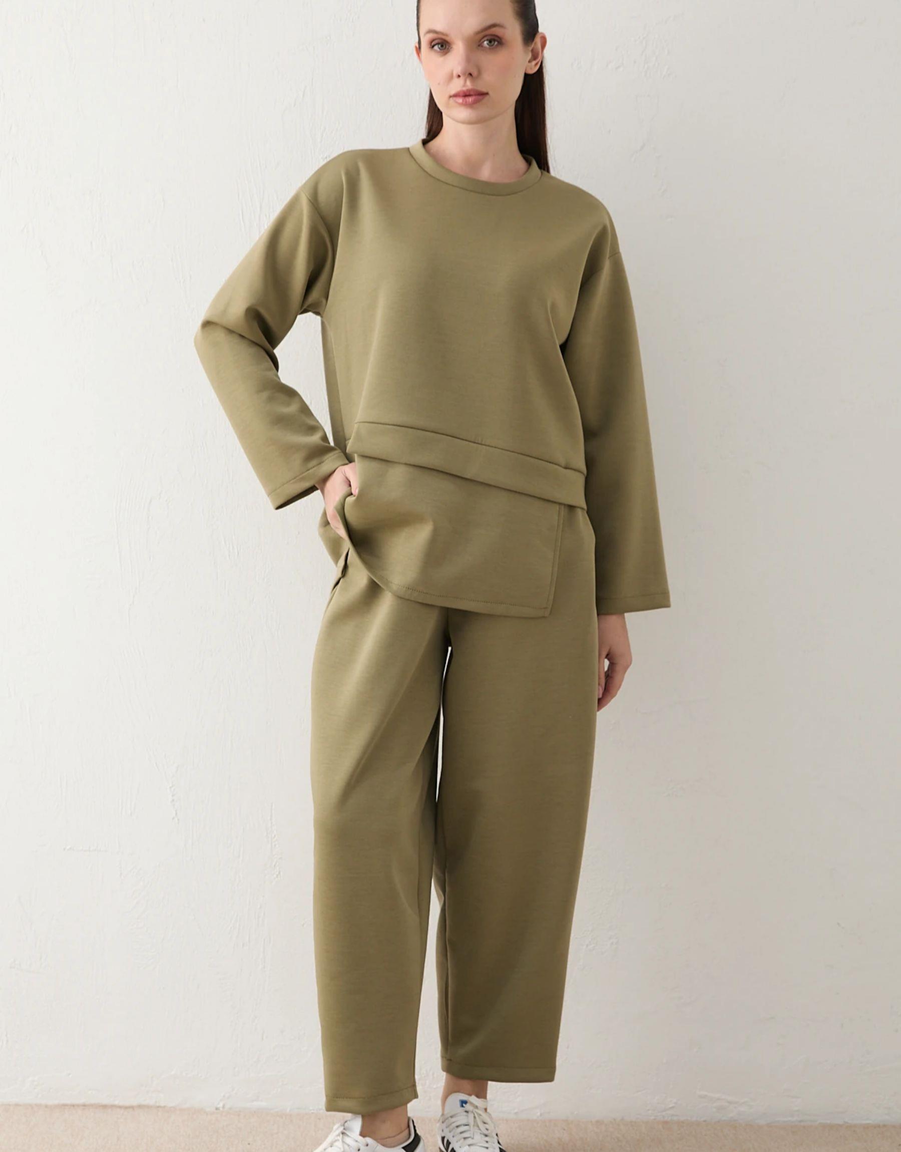 Modern kesimi ve asimetrik yırtmaç detaylarıyla öne çıkan bu takım, örme modal kumaşın yumuşak ve dökümlü yapısıyla gün boyu konfor sunar. Ön kısımdaki kumaş detayı tasarıma hareket kazandırırken, düşük omuz kesimi rahat bir siluet oluşturur. Lastikli bel yapısına sahip pantolonu ve yan cepleriyle hem şık hem kullanışlı bir alternatiftir.